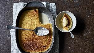 Bake in the oven for 40–45 minutes until the pudding is golden brown. Serve hot or warm, with or without cream.